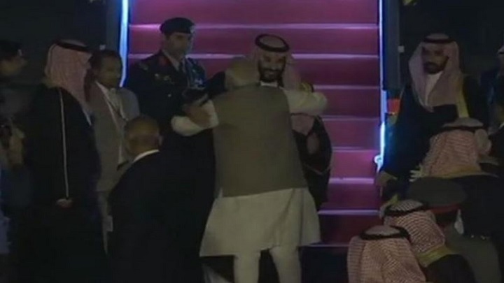 #WATCH Prime Minister Narendra Modi receives Saudi Arabia Crown Prince Mohammed bin Salman upon his arrival in India. pic.twitter.com/huwzGrPhFG