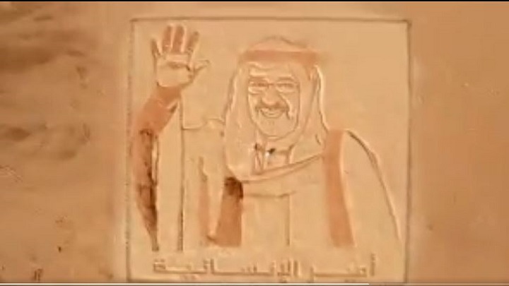 കുവൈത്ത് അമീർ ശൈഖ് സബാഹ് ജാബിർ അൽ സബാഹിൻ്റെ ചിത്രം മണലിൽ തീർത്താണു ശൈഖ് മുഹമ്മദ് ദേശീയ ദിനത്തിനു തൻ്റെ അഭിവാദ്യം അർപ്പിച്ചത്.
