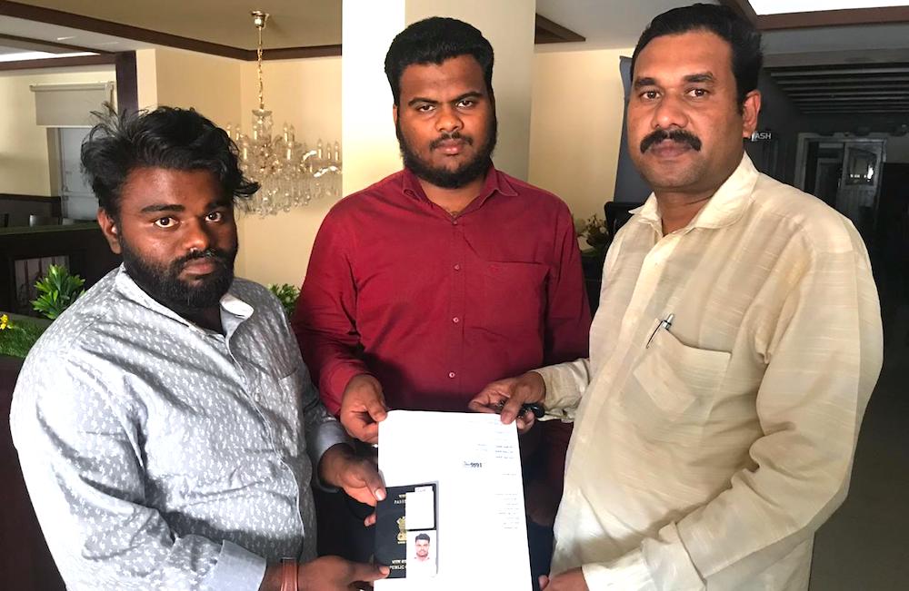 ഫോട്ടോ: അശോക് കുമാറിന് (ഇടത്) ഷിബുകുമാർ യാത്രാരേഖകൾ കൈമാറുന്നു. യാസിർ സമീപം.