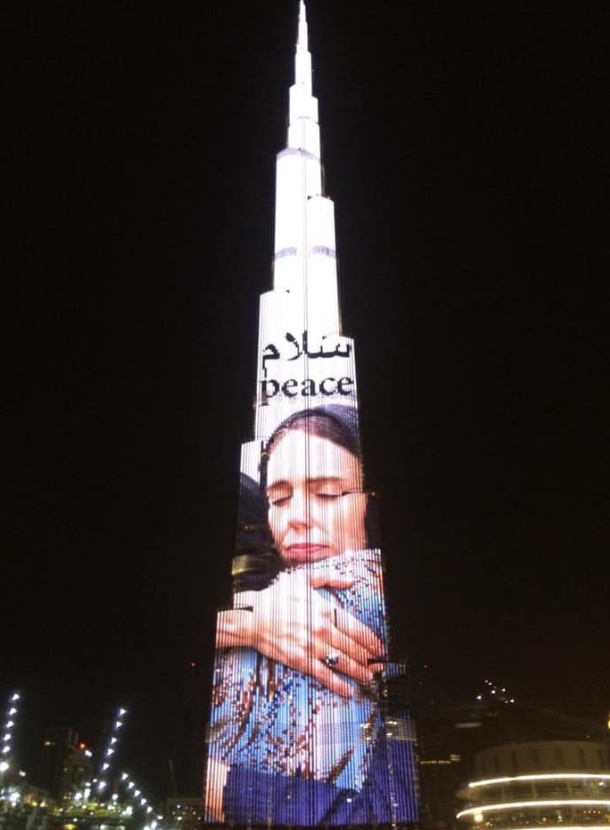 ഭീകരാക്രമണത്തിൽ കൊല്ലപ്പെട്ടവരെ ചേർത്ത് പിടിച്ച് മാനവികതയുടെ പര്യായമായി മാറിയ ന്യൂസിലാന്റ് പ്രധാനമന്ത്രി ജസീന്ത അർദെനിന്റെ ചിത്രം ബുർജ് ഖലീഫയിലും തെളിഞ്ഞു.