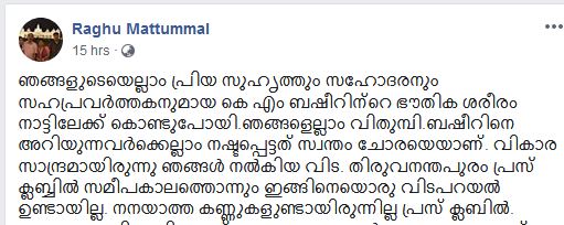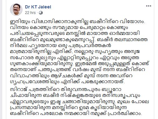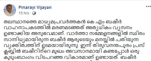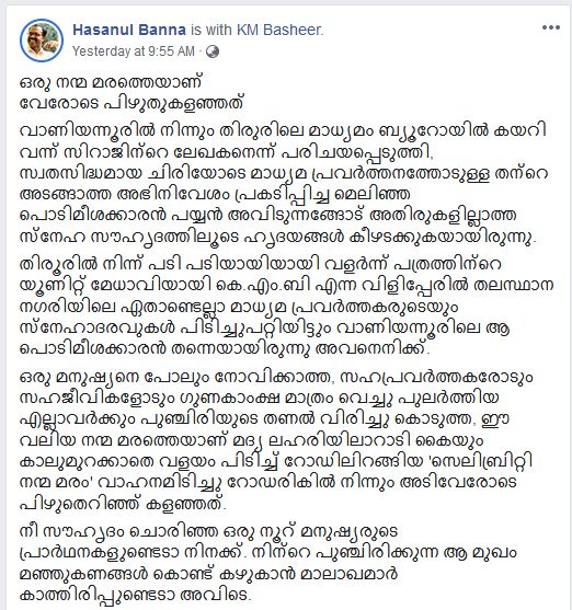 ഇത് വരെ നേരിട്ട് കാണാത്തവരെക്കൂടി ഏറെ വിഷമിപ്പിച്ച ഒരു അന്ത്യ യാത്രയായിരുന്നു കഴിഞ്ഞ ദിവസം വാഹനാപകടത്തിൽ മരണപ്പെട്ട കെ എം ബഷീറിൻ്റേത്. ജീവിത കാലത്ത് എല്ലാവരോടും സൗമ്യതയോടും പുഞ്ചിരിയോടും കൂടി മാത്രം പെരുമാറിയിരുന്ന ബഷീറിൻ്റെ അന്ത്യ യാത്രയും ആ നിറ പുഞ്ചിരി കാത്ത് സൂക്ഷിച്ചു കൊണ്ടായിരുന്നു. ബഷീറുമായി ബന്ധമുള്ളവർക്കാർക്കും അദ്ദേഹത്തിൻ്റെ നിറഞ്ഞ പുഞ്ചിരിയും പെരുമാറ്റവും സൗഹൃദവും സമ്മാനിച്ച സന്ദർഭങ്ങൾ മറക്കാൻ സാധിക്കുമായിരുന്നില്ല.