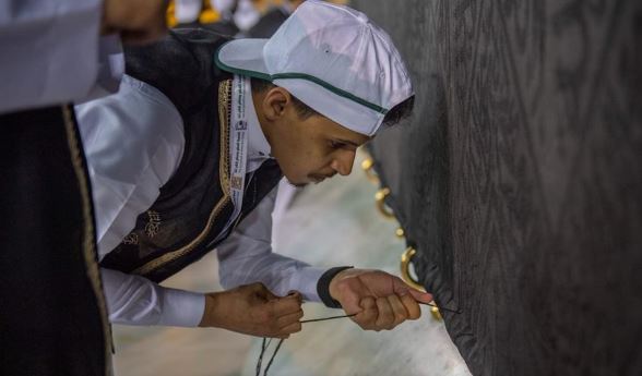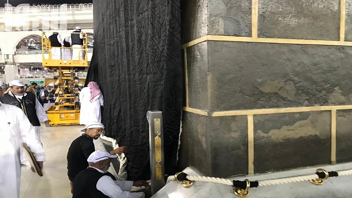 താഴ്ത്തിയ കിസ്വ താഴെ ഉറപ്പിച്ചിട്ടുളള ഗോൾഡൻ റിങ്ങുകളിൽ ഉറപ്പിക്കുകയും ചെയ്തു.
