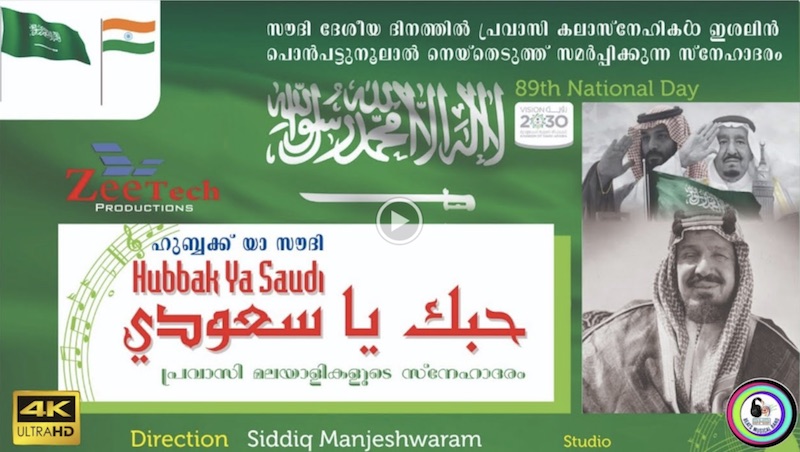 റിയാദ്: കൈക്കുമ്പിൾ നിറയെ സമൃദ്ധികോരിത്തന്ന പ്രിയനാടിന്റെ ദേശീയദിനത്തിൽ പ്രവാസികലാസ്നേഹികൾ ഒരുക്കുന്ന ഇശലിൻ പട്ടുനൂലാൽ നെയ്തെടുത്ത സ്നേഹാദരം, സൗദി അറേബ്യൻ ദേശീയ ദിനത്തിൽ Zee Tech Production ൽ അസീസ് കടലുണ്ടി നിർമ്മിച്ച് സിദ്ദിഖ് മഞ്ചേശ്വരം സംവിധാനം ചെയ്ത ഒരു കളർ ഫുൾ വീഡിയോ ആൽബമാണ് ഹുബ്ബക് യാ സൗദി പ്രേക്ഷകർക്ക് മുമ്പിൽ എത്തിക്കുന്നത്.