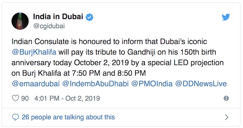 ബുർജ് ഖലീഫയിൽ ഗാന്ധിജിയുടെ ചിത്രം പ്രദർശിപ്പിച്ചുകൊണ്ടാണ് യു എ ഇ ഗാന്ധിജിയോടുള്ള ആദരവ് പ്രകടിപ്പിച്ചത്.