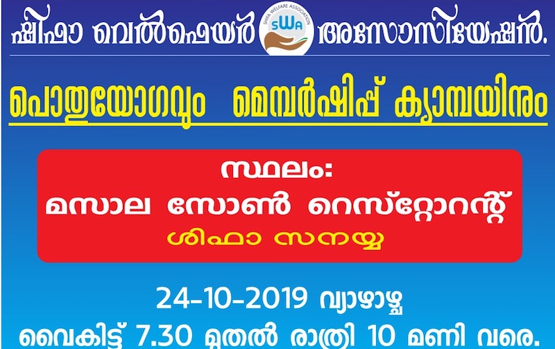 റിയാദ്: ഷിഫാ വെൽഫെയർ അസോസിയേഷൻ നാളെ (24-10-2019 വ്യാഴാഴ്ച) വൈകിട്ട് 7.30മുതൽ രാത്രി 10 30 വരെ ഷിഫാ മസാല സോൺ റെസ്റ്റോറന്റിൽ വെച്ച് പൊതു യോഗം ചേരും.