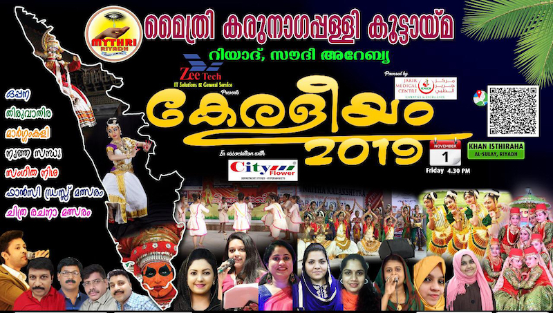 റിയാദ്: മൈത്രി കരുനാഗപ്പള്ളി കൂട്ടായമ കേരളപ്പിറവിയോടനുബന്ധിച്ച് ‘കേരളീയം 2019’ എന്ന പരിപാടി നവംബര് 1-ാം തീയതി വെള്ളിയാഴ്ച്ച വൈകിട്ട് 5 മണിമുതല് ഖാന് ഇസ്തിറാഹയില് പ്രത്യേകം സജ്ജീകരിച്ച വേദിയില് വിവിധ പരിപാടികളോടെ അരങ്ങേറും.