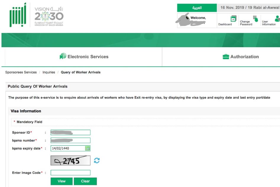 തുടർന്ന് തെളിയുന്നത് താഴെ കൊടുത്തത് പോലുള്ള ഭാഗമായിരിക്കും. അതിലെ സ്പോൺസർ ഐഡി എന്ന ഭാഗത്ത് സ്പോൺസറുടെ ഐഡി അഥവാ കംബനി ഐ ഡി നംബർ എൻ്റർ ചെയ്യുക. തുടർന്ന് ഇഖാമ നംബരും ഇഖാമ എക്സ്പയറി ഡേറ്റും എൻ്റർ ചെയ്യുക. കൂടെ വ്യക്തമാകുന്ന ഇമേജ് കോഡും എൻ്റർ ചെയ്യുക.