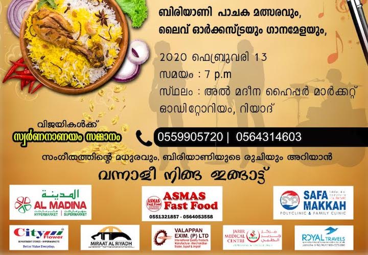 ഇതിനോടനുബന്ധിച്ച് റിയാദിലെ പ്രമുഖ കലാകാരന്മാര് അണി നിരക്കുന്ന ലൈവ് ഓര്ക്കസ്ട്ര ഗാനമേളയും, വിവിധ ന്യത്ത ന്യത്വങ്ങളും അരങ്ങേറും. കൂടുതല് വിവരങ്ങള്ക്ക് ഷുക്കൂര് ആലുവ 0559905720 ഹര്ഷദ് എം.ഡി 0564314603 എന്നിവരെ ബന്ധപ്പെടാവുന്നതാണ്.
