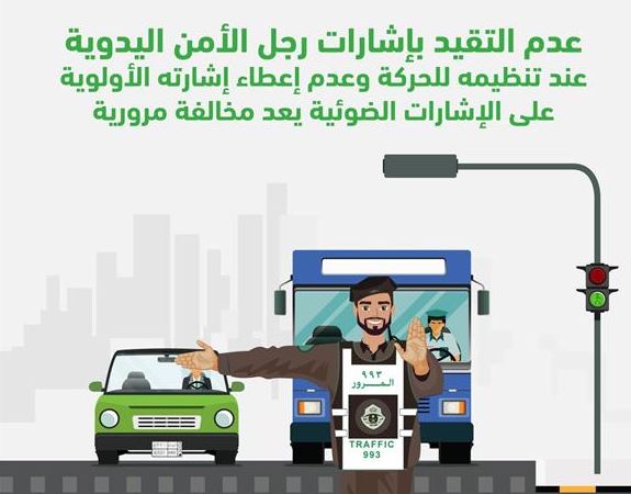 റിയാദ്:ചില സന്ദർഭങ്ങളിൽ സിഗ്നൽ ലൈറ്റ് കേടില്ലാതെ പ്രവർത്തിക്കുന്നതിനിടെ ട്രാഫിക് പോലീസുകാരൻ കൈ കൊണ്ട് മറ്റു നിർദ്ദേശങ്ങൾ നൽകുകയാണെങ്കിൽ അനുസരിച്ചില്ലെന്ങ്കിൽ പിഴ ഒടുക്കേണ്ടി വരുമെന്ന് ഓർക്കുക.