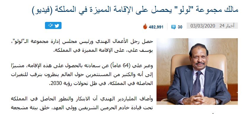 ലുലു ഗ്രൂപ്പ് മേധാവിയും ഇന്ത്യൻ ബിസിനസുകാരനുമായ് യൂസുഫലിക്ക് സൗദിയുടെസ്പെഷ്യൽ ഇഖാമ ലഭിച്ചു എന്ന തലക്കെട്ടോടെയായിരുന്നു പ്രമുഖ അറബ് ന്യൂസ് പോർട്ടലുകൾ വാർത്ത പ്രസിദ്ധീകരിച്ചത്.