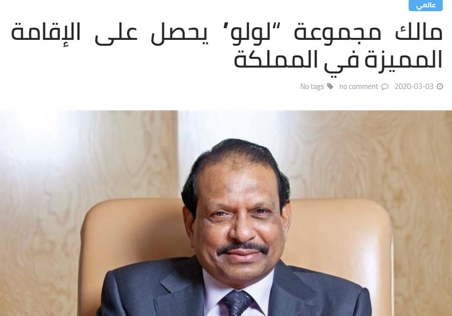 യൂസുഫലിക്ക് സ്പെഷ്യൽ ഇഖാമ ലഭിച്ചത് സൗദി മാധ്യമങ്ങളിലും പ്രധാന വാർത്തയായി