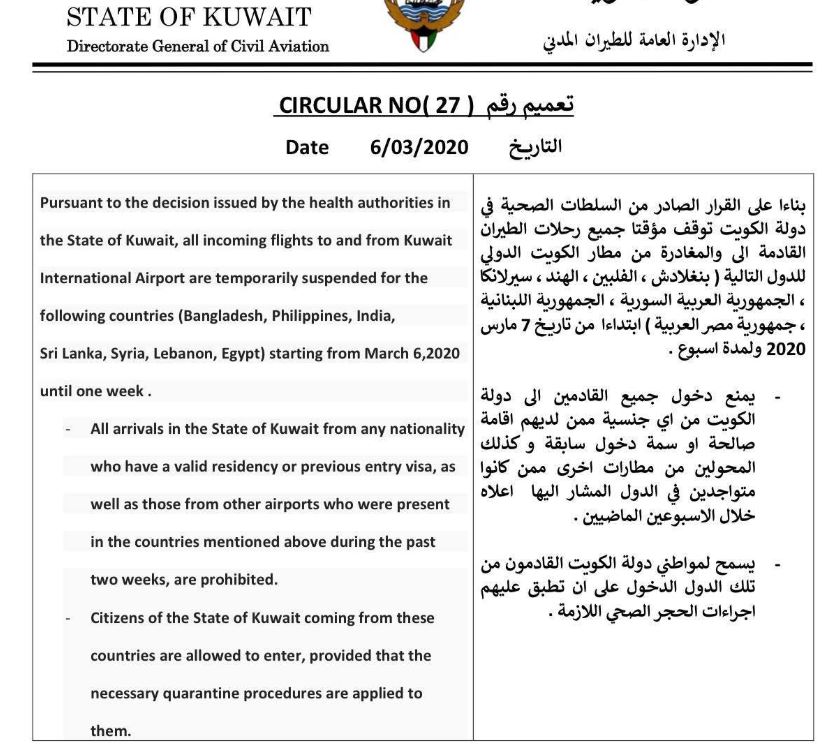 കുവൈത്ത് അന്താരാഷ്ട്ര വിമാനത്താവളത്തിലേക്കും തിരിച്ചും ഈ രാജ്യങ്ങളിൽ നിന്ന് സർവീസ് നടത്തുന്ന വിമാനക്കംബനികൾക്ക് ഇത് സംബന്ധിച്ച് സിവിൽ ഏവിയേഷൻ സർക്കുലർ നൽകിക്കഴിഞ്ഞു.