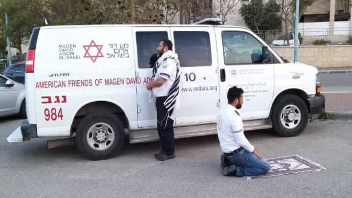 ഇസ്രായേൽ എമർജൻസി റെസ്പോൺസ് സർവീസ് – എം ഡി എ യിൽ ഒരുമിച്ച് പ്രവർത്തിക്കുകയാണു ഈ രണ്ട് ആരോഗ്യ പ്രവർത്തകരും. ആഴ്ചയിൽ രണ്ടോ മൂന്നോ തവണ ഇത് പോലെ ഒരുമിച്ച് പ്രവർത്തിക്കേണ്ട സാഹചര്യവും ഒരുമിച്ച് പ്രാർഥിക്കുന്ന സന്ദർഭവും ഇരുവർക്കും പുതുമയുള്ള കാര്യമല്ലെങ്കിലും ഈ ചിത്രം ലോകത്തെ എല്ലാ ആരോഗ്യ പ്രവർത്തകർക്കും വലിയ ആവേശവും പ്രചോദനവുമാണു നൽകിയിട്ടുള്ളത്.