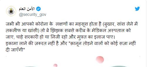 കൂടാതെ ഇഖാമ നൽകേണ്ടതില്ലെന്നും ചികിത്സ ഫ്രീ ആണെന്നും ഇഖാമ നിയമ ലംഘകർ ശിക്ഷിക്കപ്പെടില്ല എന്നും സന്ദേശത്തിൽ വ്യക്തമാക്കുന്നു.