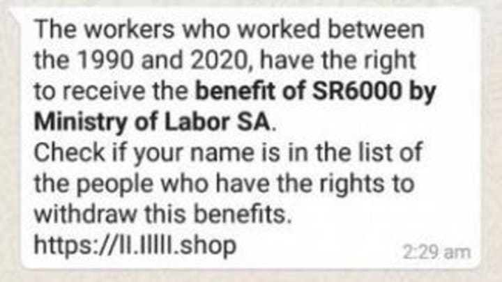 1990 നും 2020 നും ഇടയിൽ ജോലി ചെയ്തവർക്ക് 6000 റിയാൽ സൗദി തൊഴിൽ മന്ത്രാലയത്തിൽ നിന്ന് ലഭ്യമാകുന്നുണ്ടെന്നും നിങ്ങൾ അർഹനാണോ എന്നറിയാൻ ലിങ്കിൽ പരിശോധിക്കാനുമാണു ഇപ്പോൾ മെസ്സേജ് വന്നിട്ടുള്ളത്.