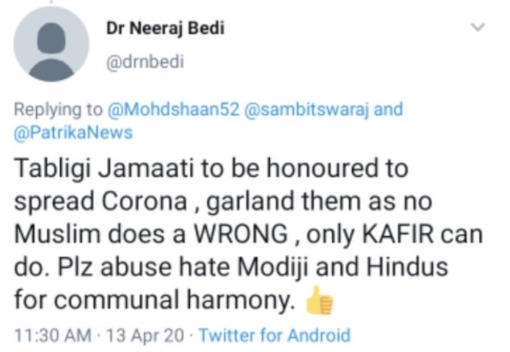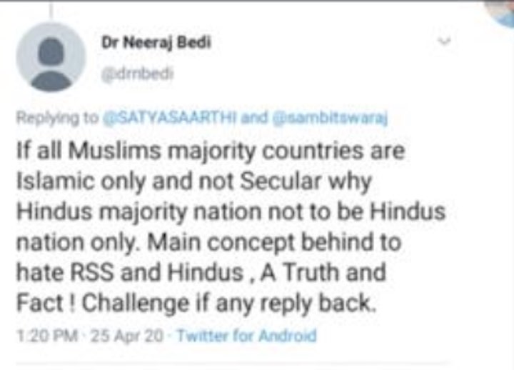എന്നാൽ സർവകലാശാലയുടെ ട്വിറ്റർ മെസ്സേജിന് താഴെ നീരജ് ബേദി എന്ന ഇന്ത്യൻ പ്രൊഫസറുടെ വർഗീയപരാമർശമുള്ള ട്വീറ്റുകളുടെ സ്‌ക്രീൻ ഷോട്ടുകളുമായി നിരവധി പേർ കമന്റ് രേഖപ്പെടുത്തിയതോടെയാണ് പിരിച്ചുവിടപ്പെട്ട പ്രൊഫസ്സർ ഇന്ത്യക്കാരനാണെന്ന് വ്യക്തമായത്.