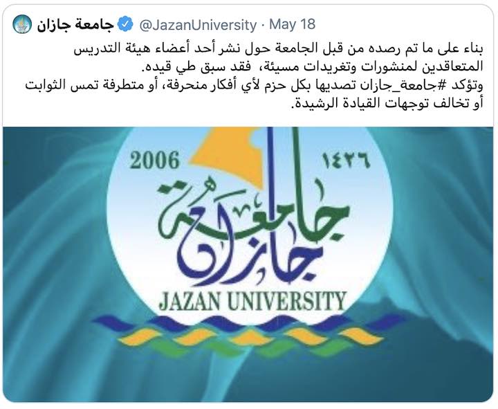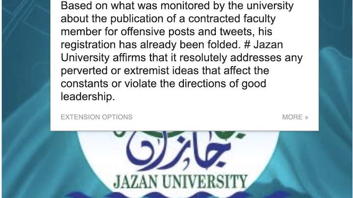ജിസാൻ: സൗദിയിൽ ഇന്നലെ ജിസാൻ സർവകലാശാലയിൽ നിന്ന് പിരിച്ചു വിടപ്പെട്ട പ്രൊഫസ്സർ, ഇന്ത്യക്കാരനാണെന്നു സൂചന. സർവ്വകലാശാല അധികൃതർ ഔദ്യോഗികമായി ഇയാളുടെ പേര് വിവരങ്ങൾ വെളിപ്പെടുത്തിയിട്ടില്ല.