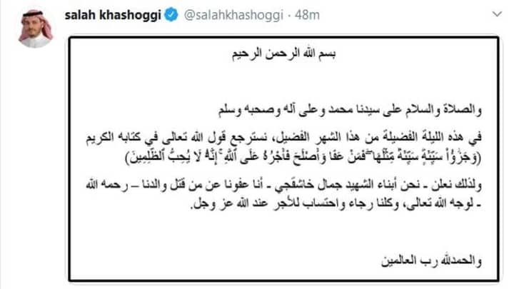 ഈ വിശുദ്ധ മാസത്തിലെ വിശുദ്ധ രാത്രിയിൽ അല്ലാഹുവിൽ നിന്നുള്ള പ്രതിഫലം ആഗ്രഹിച്ച് ഞങ്ങളുടെ പിതാവിൻ്റെ ഘാതകർക്ക് മാപ്പ് നൽകുന്നതിനു ഞങ്ങൾ മക്കൾ തീരുമാനിച്ചതായാണു സ്വലാഹ് ഖശോഗി ട്വിറ്ററിൽ കുറിച്ചത്.