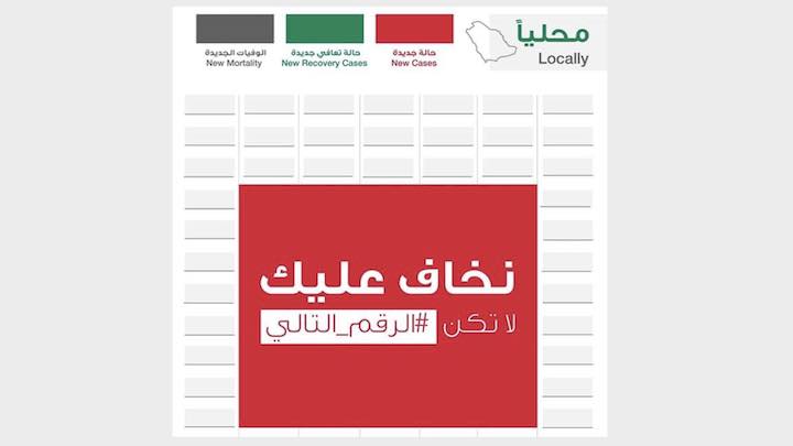 ഞങ്ങൾ നിങ്ങളെക്കുറിച്ച് ഭയക്കുന്നു; അടുത്ത നമ്പർ നിങ്ങളാകാതിരിക്കുക എന്ന ഉദ്ബോധന വാചകവുമായാണു സ്പെഷ്യൽ കാംബയിൻ നടത്തുന്നത്. ഉദ്ബോധന വാചകത്തോടൊപ്പം എല്ലാ വിവരങ്ങളും മായ്ച്ച രീതിയിലുള്ള സൗദി ആരോഗ്യ മന്ത്രാലയത്തിൻ്റെ ദൈനം ദിന കൊറോണ റിപ്പോർട്ടിനു സമാനമായ ചിത്രം നൽകിയിരിക്കും.