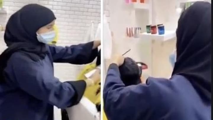 തൻ്റെ മുന്നിലുള്ള ഒരു കുട്ടിയുടെ തല മുടി സൗദി യുവതി വെട്ടുന്ന ദൃശ്യമാണു വീഡിയോയിൽ കാണാൻ സാധിക്കുന്നത്.