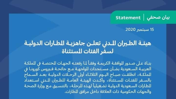 സൗദിയിലെ മുഴുവൻ എയർപോർട്ടുകളും യാത്രാനുമതി ലഭിച്ചവരെ സ്വീകരിക്കാനായി ആരോഗ്യ മന്ത്രാലയത്തിൻ്റെയും മറ്റു സർക്കാർ ഏജൻസികളുടെയും സഹായത്തോടെ സജ്ജമായതായും സിവിൽ ഏവിയേഷൻ പ്രസ്താവിച്ചു.