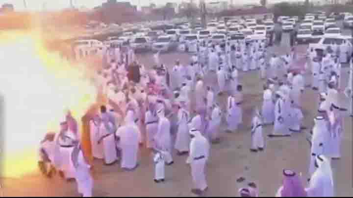 സൗദിഅറേബ്യയുടെ തെക്കു ഭാഗത്ത് നടന്ന ഒരു ആഘോഷത്തിനിടെയാണ് സംഭവം. റൈഫിളുകൾ ഉപയോഗിച്ച് വെടിയുതിർക്കുന്നതും തുടർന്ന് കൂടി നിൽക്കുന്നവരുടെ കൂട്ടത്തിൽ ഒരാളുടെ ശരീരത്തിലേക്ക് തീ പടരുന്നതും വീഡിയോയിൽ കാണാം.