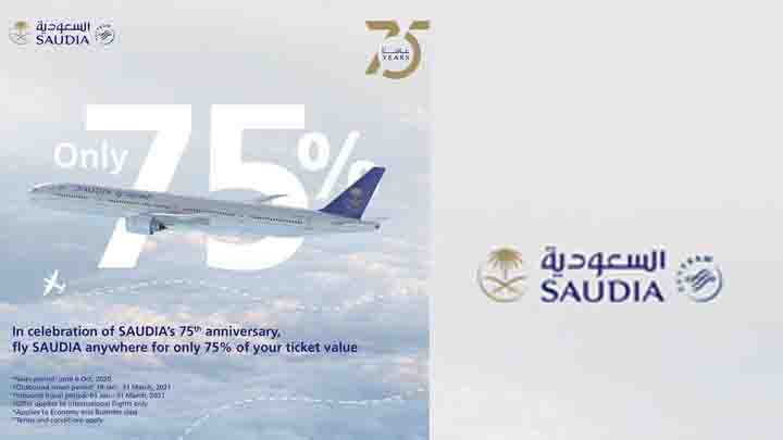 75-ാം വാർഷികം പ്രമാണിച്ച് സൗദി എയർലൈൻസ് യാത്രക്കാർക്ക് കിഴിവുകൾ പ്രഖ്യാപിച്ചു. ഓഫർ പ്രകാരം ടിക്കറ്റുകൾക്ക് നിലവിലുള്ള ചാർജിന്റെ 75% മാത്രം നൽകിയാൽ മതിയാവും. അന്താരാഷ്ട്ര യാത്രകൾക്ക് മാത്രമാണ് കിഴിവുകൾ ലഭിക്കുക.