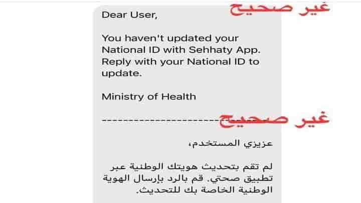 ആരോഗ്യ മന്ത്രാലയത്തിൻ്റെ സ്വിഹതീ ആപിൽ നാഷണൽ ഐ ഡി അപ്ഡേറ്റ് ചെയ്തിട്ടില്ലെന്നും അപ്ഡേറ്റ് ചെയ്യാനായി ഐഡി സഹിതം റീപ്ളേ ചെയ്യണമെന്നും അറിയിച്ചാണു മെസേജ് വരുന്നത്.