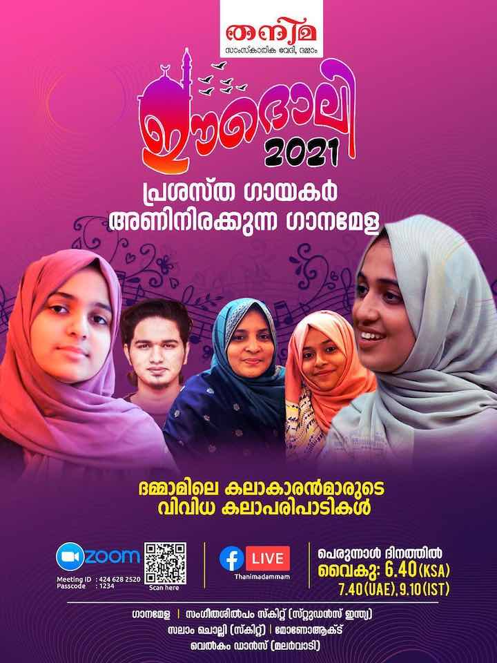 ഉള്ക്കൊള്ളിച്ചുള്ള ഗാനമേള, മലര്വാടി, സ്റ്റുഡന്റ്സ് ഇന്ത്യ കുട്ടികള് അവതരിപ്പിക്കുന്ന വ്യത്യസ്തങ്ങളായ കലാപരിപാടികള്, തനിമാ കലാവേദിയുടെ ഷോര്ട്ട് ഫിലിം എന്നിവ ഉള്ക്കൊള്ളിച്ച് കൊണ്ടുള്ള പരിപാടി പെരുന്നാള് ദിനത്തില് വൈകിട്ടി 6.40ന് ആരംഭിക്കുമെന്ന് ഭാരവാഹികള് അറിയിച്ചു.