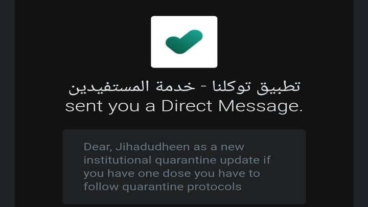പുതിയ ഇൻസ്റ്റിറ്റ്യൂഷണൽ ക്വാറൻ്റീൻ അപ്ഡേറ്റ് പ്രകാരം ഒരു ഡോസ് ആണു സ്വീകരിച്ചതെങ്കിൽ ക്വാറൻ്റീൻ പ്രോട്ടോക്കോൾ പിന്തുടരേണ്ടതുണ്ടെന്നാണു തവക്കൽനാ മറുപടിയിൽ സൂചിപ്പിച്ചിട്ടുള്ളത്.