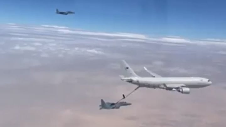 സൗദി ഫൈറ്റർ ജെറ്റ് കടലിലെ ലക്ഷ്യ സ്ഥാനം ബോംബിട്ട് തകർക്കുന്നതിൻ്റെയും ആകാശത്ത് നിന്ന് എം ആർ ടി ടി ഫ്ളൈറ്റിൽ നിന്ന് ഇന്ധനം സ്വീകരിക്കുന്നതിൻ്റെയും വീഡിയോ വൈറലാകുന്നു