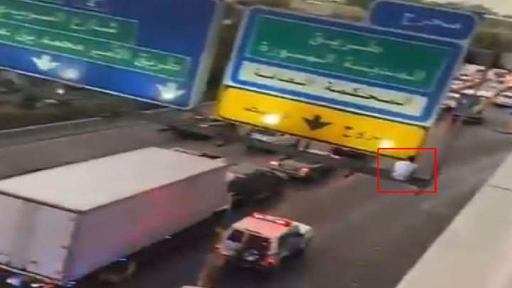 റിയാദിൽ മെയിൻ റോഡിലെ സൈൻ ബോർഡിൽ കുടുങ്ങി യുവാവ്; വീഡിയോ