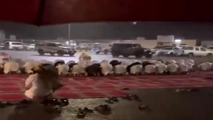 തുറന്ന സ്ഥലത്ത് തറാവീഹ് നമസ്ക്കരിക്കുന്നതിനിടെ ശക്തമായ മഴ പെയ്തിട്ടും കാറ്റ് വീശിയിട്ടും നമസ്ക്കാരം മുടക്കാതെ തുടരുന്ന കാഴ്ചയാണ് ശ്രദ്ധേയമായത്.