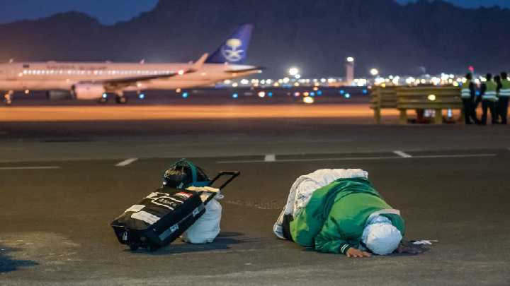 വിശുദ്ധ ഹജ്ജിനായി സൗദിയിലെത്തിയ വിദേശ തീർഥാടക എയർപോർട്ട് റൺ വേക്ക് സമീപം സുജൂദ് ചെയ്യുന്ന കാഴ്ച സോഷ്യൽ മീഡിയകളിൽ വൈറലായി.