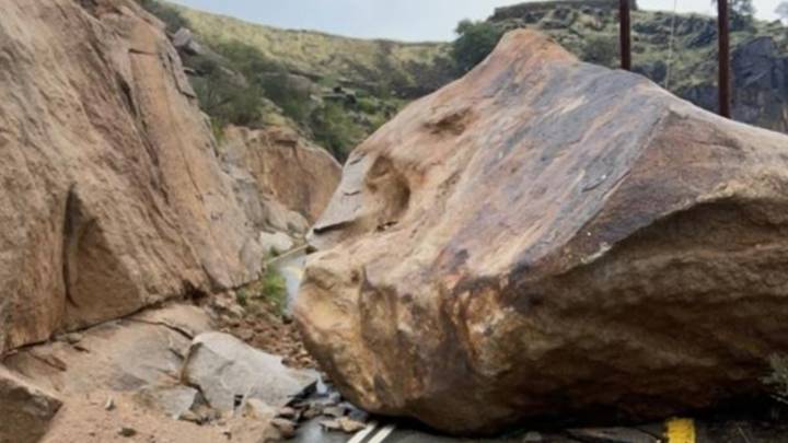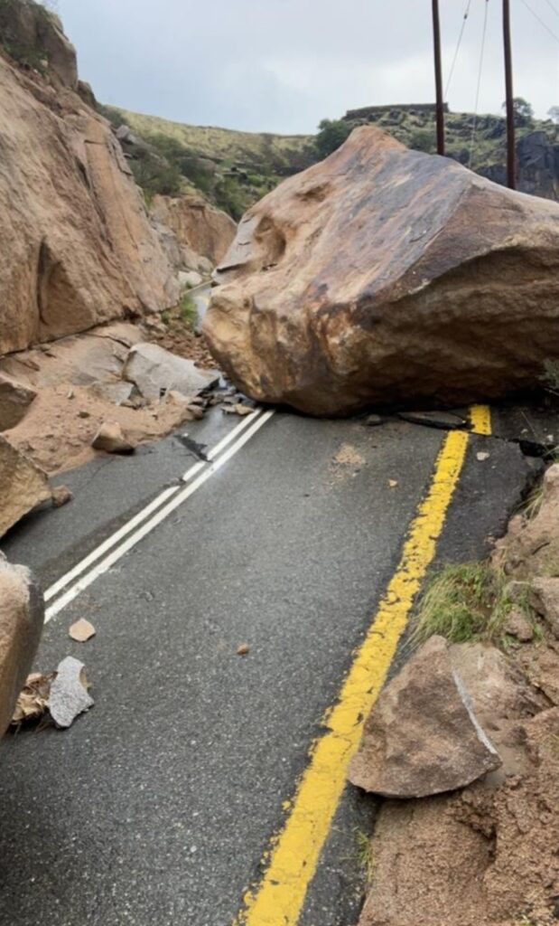 സൗദിയിലെ അൽബാഹയിലെ മിഖ് വയിലെ ജബൽ ശദയിലുണ്ടായ മലയിടിച്ചിലിൽ വൻ പാറക്കല്ലുകൾ റോഡിലേക്ക് വീണു.