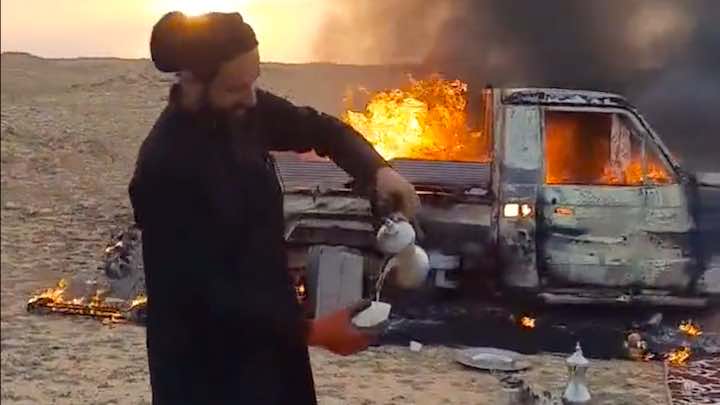 കത്തിക്കൊണ്ടിരിക്കുന്ന തന്റെ കാറിനരികെ നിന്നുകൊണ്ട് അതിഥികൾക്ക് കാപ്പി പകർന്നു കൊടുക്കുന്ന സൗദി പൗരന്റെ വീഡിയോ വൈറലാകുന്നു.