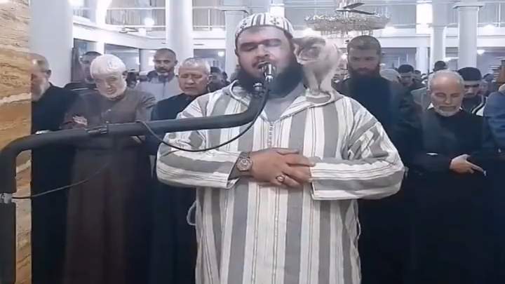 തറാവീഹ് നമസ്ക്കാരം നിർവ്വഹിക്കുന്ന ഇമാമിന്റെ ശരീരത്തിലേക്ക് പൂച്ച കയറുന്നതാണ് ദൃശ്യം.