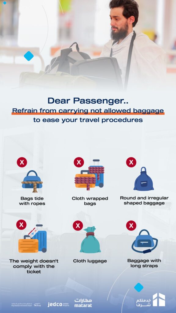 തുണിക്കഷ്ണങ്ങൾ കൊണ്ടും കയർ കൊണ്ടുമെല്ലാം വരിഞ്ഞ് കെട്ടിയ ലഗേജുകൾ, ക്രമരഹിതമായതും റൗണ്ടിലുള്ളതുമായ ലഗേജുകൾ, നീണ്ട സ്ട്രാപുകളുള്ള ലഗേജുകൾ, തുണി സഞ്ചികൾ ലഗേജാക്കിയത്, ടിക്കറ്റിൽ അനുവദിക്കപ്പെട്ടതിലും കൂടുതൽ ഭാരമുള്ള ലഗേജുകൾ എന്നിവയെല്ലാം അനുവദിക്കാത്തതും യാത്രക്കാരുടെ യാത്രാ നടപടികൾ വൈകിപ്പിക്കാൻ ഇടയാക്കുന്നവയുമാണെന്ന് എയർപോർട്ട് അധികൃതർ ഓർമ്മപ്പെടുത്തുന്നു.