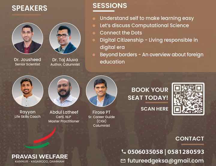 ഒന്പതു മുതല് പന്ത്രണ്ടാം ക്ലാസ് വരെയുള്ള മലയാളി വിദ്യാര്ഥികള്ക്കായി പ്രവാസി വെല്ഫെയര് – ദമ്മാമില് സംഘടിപ്പിക്കുന്ന ഫ്യൂച്ചര് എഡ്ജ് കോണ്ഫറന്സ് മേയ് 19നു നടക്കും.
