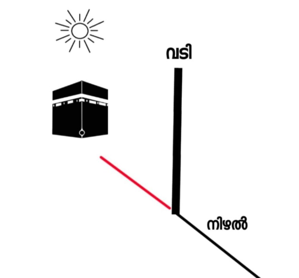 28 – 05 – 2023 (ഞായർ) സഊദി സമയം ഉച്ചക്കു 12.18 ( ഇന്ത്യൻ സമയം 2.48) ന് കഅബക്കു നേർ മുകളിൽ സൂര്യൻ വരുന്ന സമയമാണ്. അപ്പോൾ കഅബക്ക് തീരെ തന്നെ നിഴലുണ്ടായിരിക്കില്ല. ഈ സമയത്ത് ലോകത്തിന്റെ ഏതു ഭാഗത്തു വെച്ചും ഒരുപകരണത്തിന്റേയും സഹായം കൂടാതെ തന്നെ ഖിബ്’ലയുടെ ദിശ ആർക്കും നിർണ്ണയിക്കാം. വെയിലുള്ള ഒരു സ്ഥലത്ത് വളവില്ലാത്ത ഒരു വടി പോലെയുള്ള എന്തെങ്കിലും നേരെ കുത്തിവെച്ചാൽ ഭൂമിയിൽ പതിയുന്ന അതിന്റെ നിഴൽ ഒരു രേഖയായി സങ്കല്പിച്ചാൽ ആ രേഖ കൃത്യമായി ഖിബ്’ലക്കു നേരെയായിരിക്കും. ഇങ്ങനെ ഒരു ചാൻസ് ഇനി അടുത്ത ജൂലൈ മാസത്തിലാണ് ലഭിക്കുക. ഈ തിയ്യതി യുടെ ഒന്നോ രണ്ടോ ദിവസം മുമ്പോ പിമ്പോ ആയാലും ഇങ്ങനെ ചെയ്യാവുന്നതാണ്. വീട്ടിലെ ഏതെങ്കിലും മുറികളിലേക്ക് സൂര്യപ്രകാശം നേരിട്ട് പതിക്കുന്നുവെങ്കിൽ അവിടെയുള്ള ജനലിന്റെ കുത്തനെയുള്ള അഴികളുടെ നിഴൽ നോക്കിയും ഖിബ്’ലയുടെ കൃത്യത ഉറപ്പു വരുത്താം. ചിത്രം കാണാം.