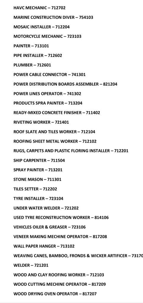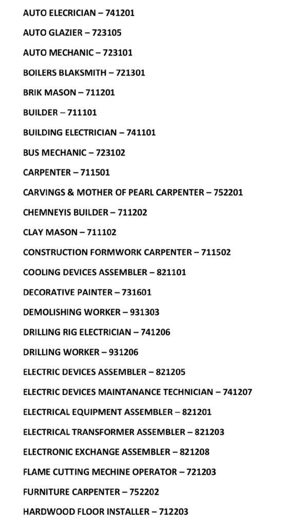 ജൂലൈ 25 മുതൽ താഴെ കൊടുത്ത പ്രൊഫഷനുകളിൽ വിസ ഇഷ്യു ചെയ്തവർക്ക് വിസ സ്റ്റാംബ് ചെയ്യണമെങ്കിൽ പാസ്പോർട്ടിനും വിസക്കുമൊപ്പം തൊഴിൽ യോഗ്യതാ ടെസ്റ്റ് നടത്തിയതിന്റെ രേഖ കൂടി സമർപ്പിച്ചിരിക്കണമെന്ന് കോൺസുലേറ്റ് ഓർമ്മപ്പെടുത്തി. കോൺസുലേറ്റ് പരാമർശിച്ച നിർദ്ദിഷ്ട 70 ലധികം വരുന്ന പ്രൊഫഷനുകളുടെ പേര് വിവരങ്ങൾ താഴെ 3 ഇമേജുകളായി കൊടുത്തിരിക്കുന്നു.