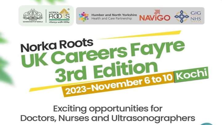 നോര്ക്ക റൂട്ട്സ് യു.കെ കരിയര് ഫെയറിന്റെ മൂന്നാമത് എഡിഷന് 2023 നവംബര് 06 മുതല് 10 വരെ കൊച്ചിയില് നടക്കും. കേരളത്തിലെ ആരോഗ്യമേഖലയില് നിന്നുളളവര്ക്ക് യുണൈറ്റഡ് കിംങഡമിലെ (UK) ഇംഗ്ലണ്ടിലെയും, വെയില്സിലേയും വിവിധ എന്.എച്ച്.എസ് ട്രസ്റ്റുകളിലേയ്ക്ക് അവസരമൊരുക്കുന്നതാണ് കരിയര് ഫെയര്.