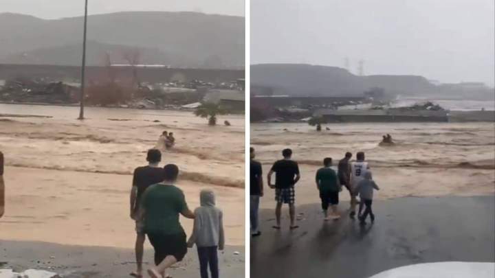 ജിദ്ദയിൽ വെള്ളപ്പൊക്കത്തിൽ രണ്ട് പേർ ഒഴുക്കിൽപ്പെട്ടതായി സോഷ്യൽ മീഡിയയിൽ പ്രചരിക്കുന്ന വീഡിയോ ക്ലിപ്പ് രേഖപ്പെടുത്തി.