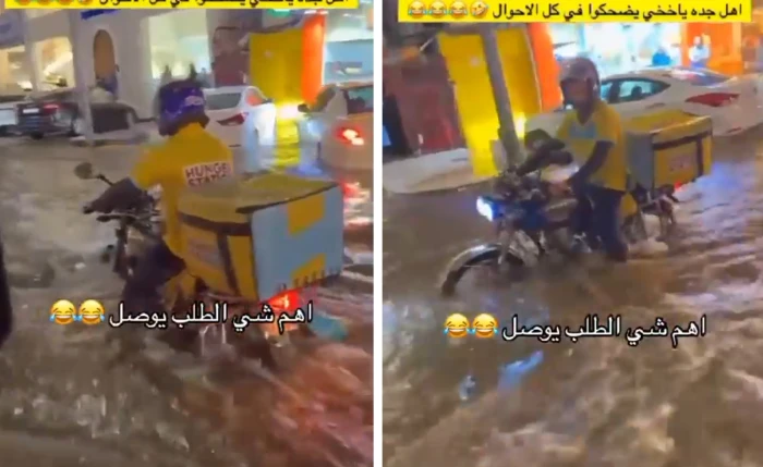 ജിദ്ദയിലെ വെള്ളപ്പൊക്കത്തിനിടയിൽ ഒരു പ്രവാസി ഡെലിവറി ഡ്രൈവർ മോട്ടോർ സൈക്കിളിൽ സാധനങ്ങളുമായി സഞ്ചരിക്കുന്നതിൻ്റെ വീഡിയോ ക്ലിപ്പ് ഒരു പൗരൻ രേഖപ്പെടുത്തി.
